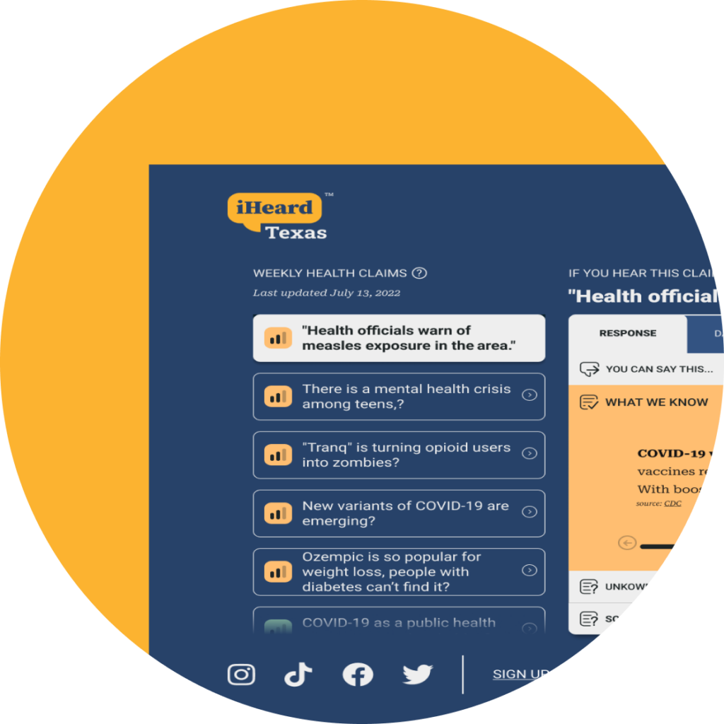 Texas CEAL Health Monitoring and Response Project (iHeard) is a weekly updated collection of health claims and topics trending in Texas. Based on surveys to residents, we aim to identify what health information people in Texas are receiving, and whether or not this information is accurate. We then develop resources and messaging our partners can share with residents to counteract any misinformation.